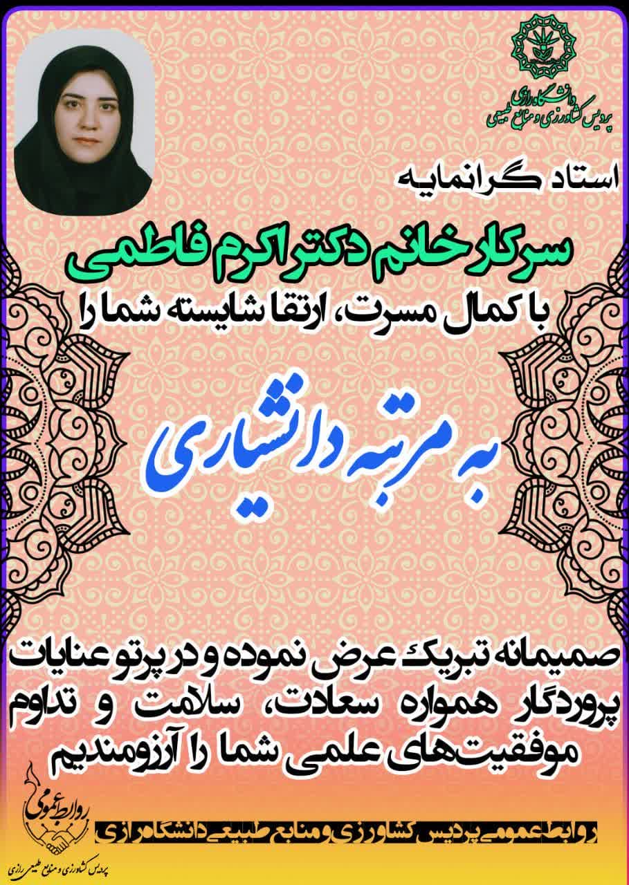 20629 ارتقاء مرتبه عضو هیئت علمی گروه ترویج و آموزش کشاورزی به گزارش روابط عمومی پردیس کشاورزی و منابع طبیعی دانشگاه رازی، نشست شانزدهم و هفدهم از دور هشتم هیأت ممیزه دانشگاههای رازی و صنعتی...