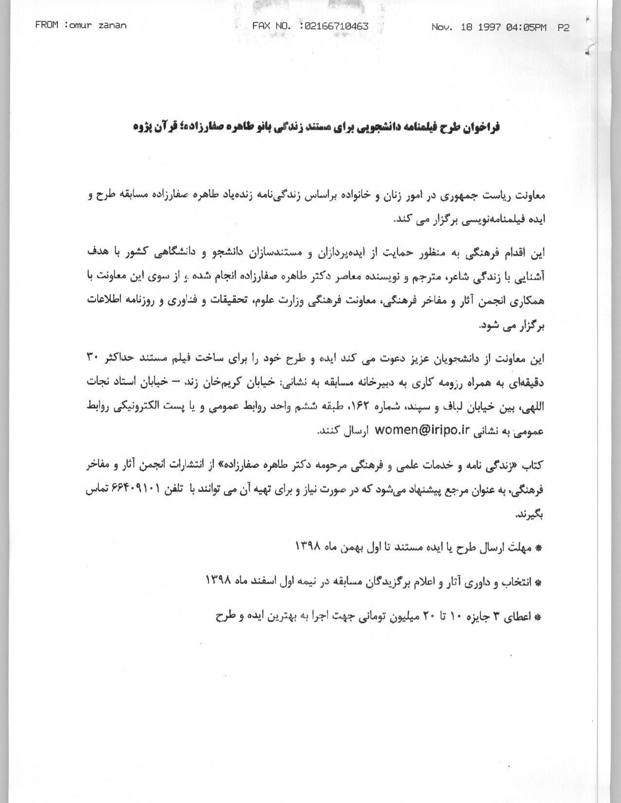 3243 فراخوان طرح فیلمنامه دانشجویی برای مستند زندگی بانو طاهره صفارزاده ; قرآن پژوه شناسه : 952829