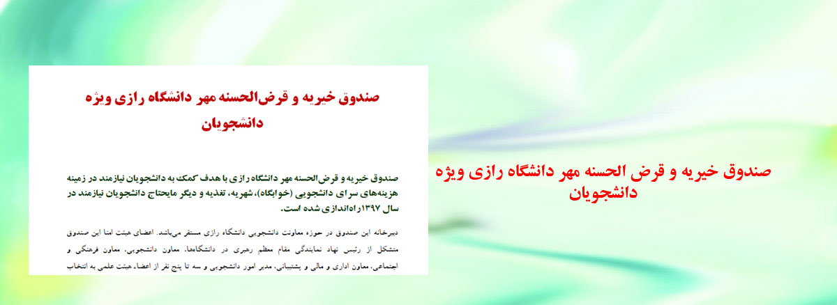 1102 صندوق خیریه و قرض الحسنه مهر دانشگاه رازی ویژه دانشجویان صندوق خیریه و قرض الحسنه مهر دانشگاه رازی ویژه دانشجویان صندوق خیریه و قرضالحسنه مهر دانشگاه رازی با هدف کمک به دانشجویان نیازمند...