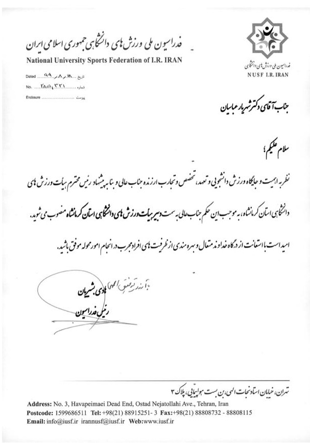 4264 حکم انتصاب آقای دکتر شهریار عباسیان مدیر تربیت بدنی دانشگاه به عنوان دبیر هیات ورزش های دانشگاهی مرکز آموزش عالی استان کرمانشاه شناسه : 952924