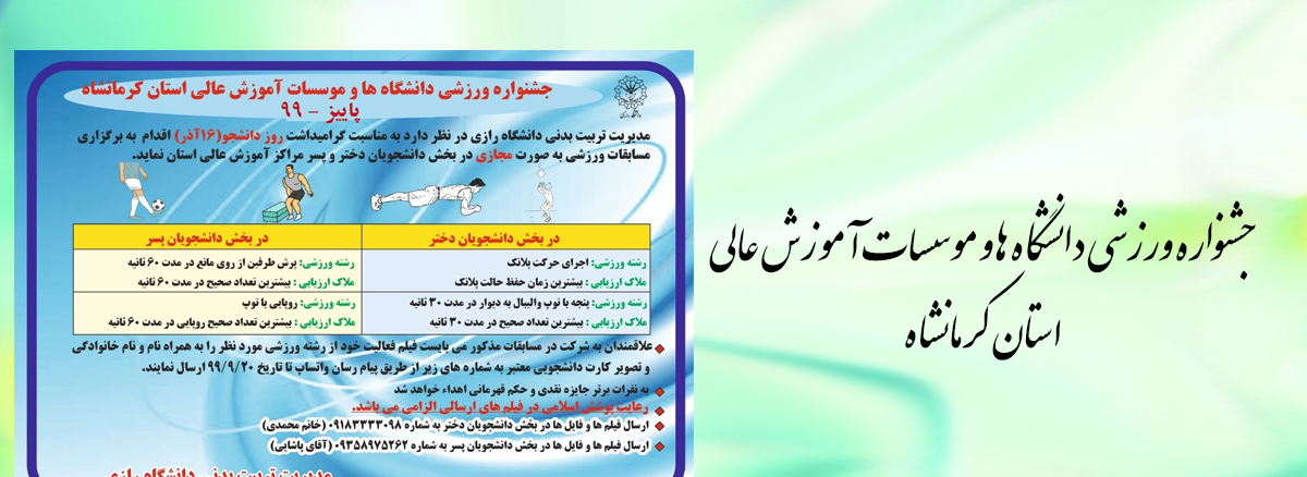 922 جشنواره ورزشی دانشگاه ها و موسسات آموزش عالی استان کرمانشاه شناسه : 952633