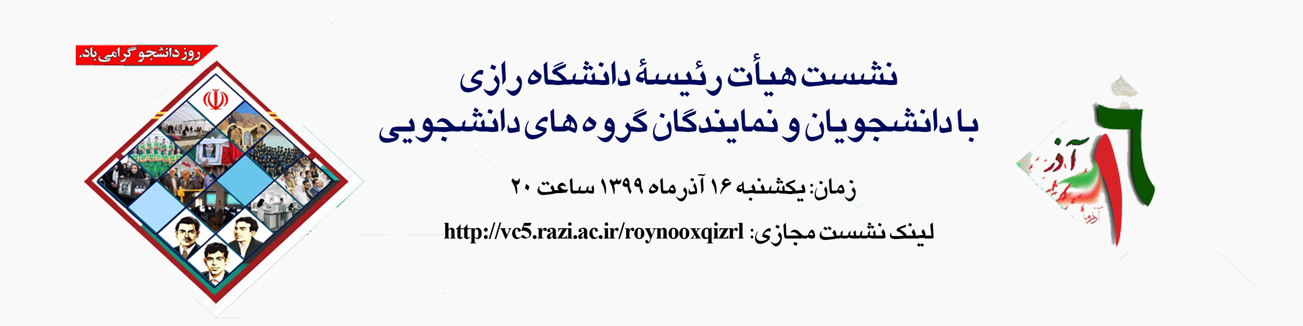 534 نشست «هیأت رئیسۀ دانشگاه با دانشجویان و نمایندگان گروه های دانشجویی» لینک ورود: http://vc۵.razi.ac.ir/roynooxqizrl شناسه : 952603