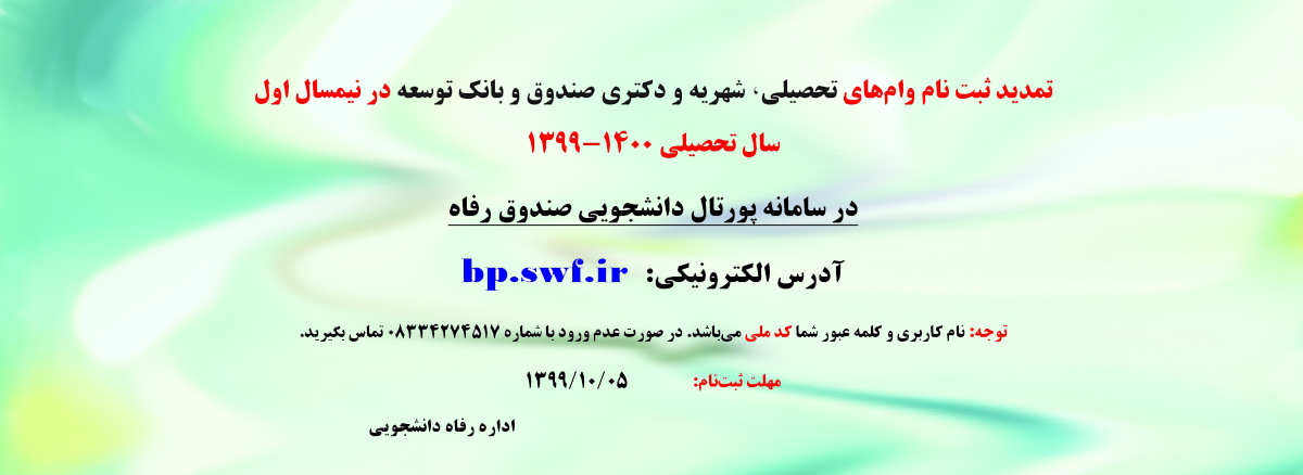 597 تمدید وام های تحصیلی-شهریه و دکتری صندوق و بانک توسعه در نیم سال اول 1399-1400 شناسه : 952557