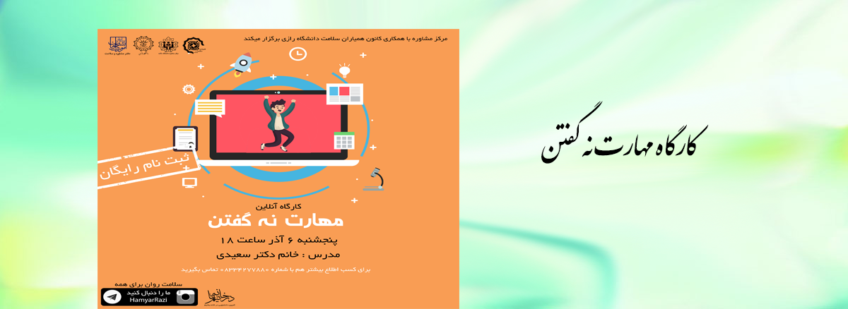 2710 کارگاه مهارت نه گفتن لینک حضور در کارگاه : https://www.skyroom.online/ch/razi1399/moshavereh شناسه : 952907