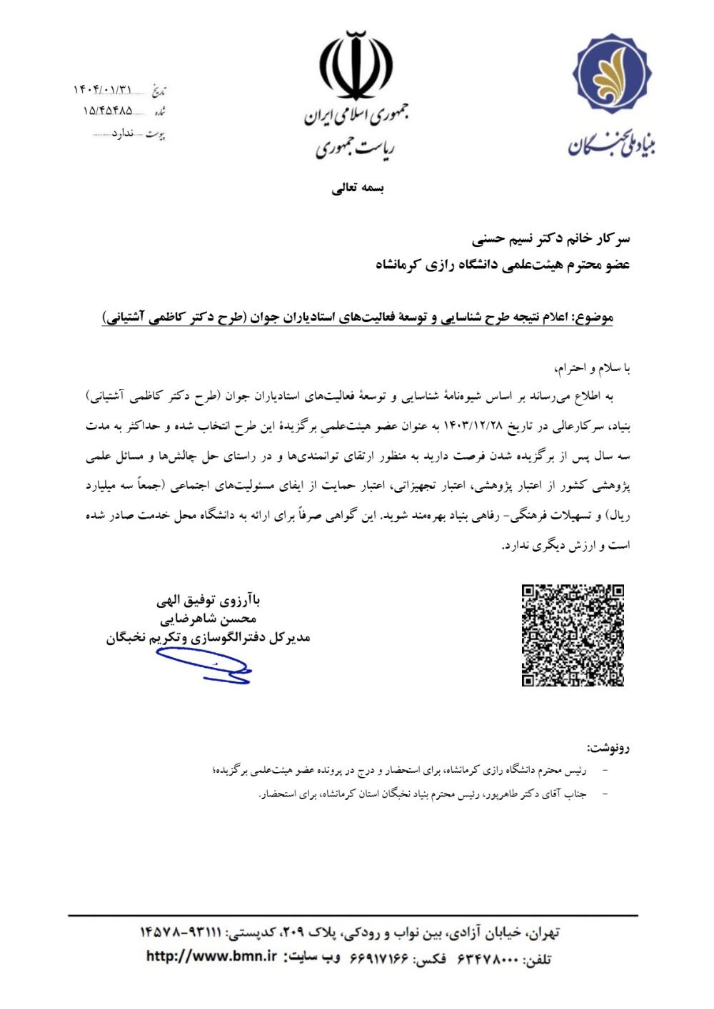 710 هیات علمی برگزیده طرح دکتر کاظمی آشتیانی خانم دکتر نسیم حسنی دکتر نسیم حسنی، عضو هیات علمی گروه شیمی فیزیک،به عنوان عضو هیات علمی برگزیده طرح دکتر کاظمی آشتیانی انتخاب گردیدند. در این طرح،...