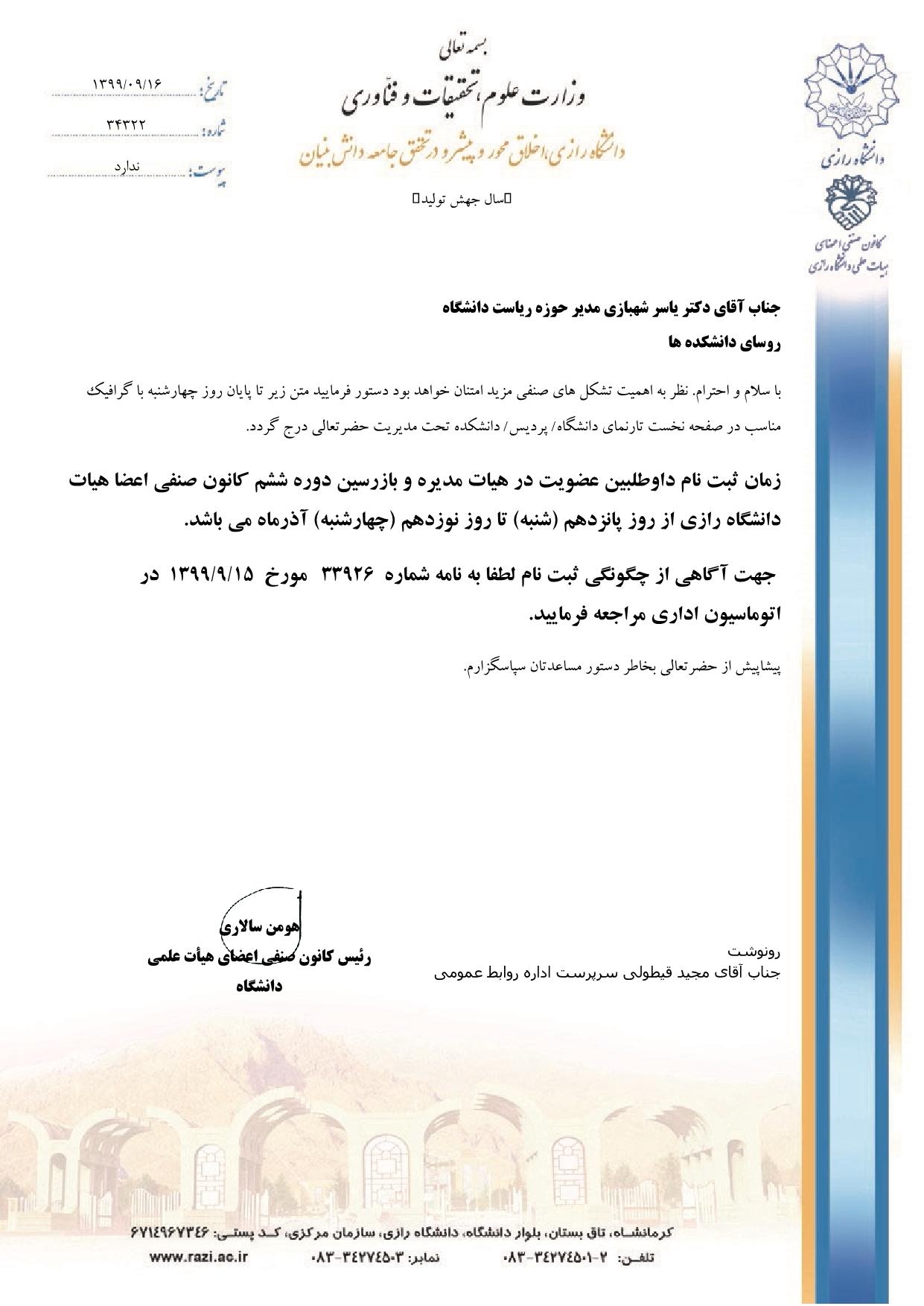زمان ثبت نام داوطلبین عضویت در هیات مدیره و بازرسین دوره ششم کانون صنفی اعضا هیات دانشگاه رازی از روز پانزدهم (شنبه) تا روز نوزدهم (چهارشنبه) آذرماه می باشد.