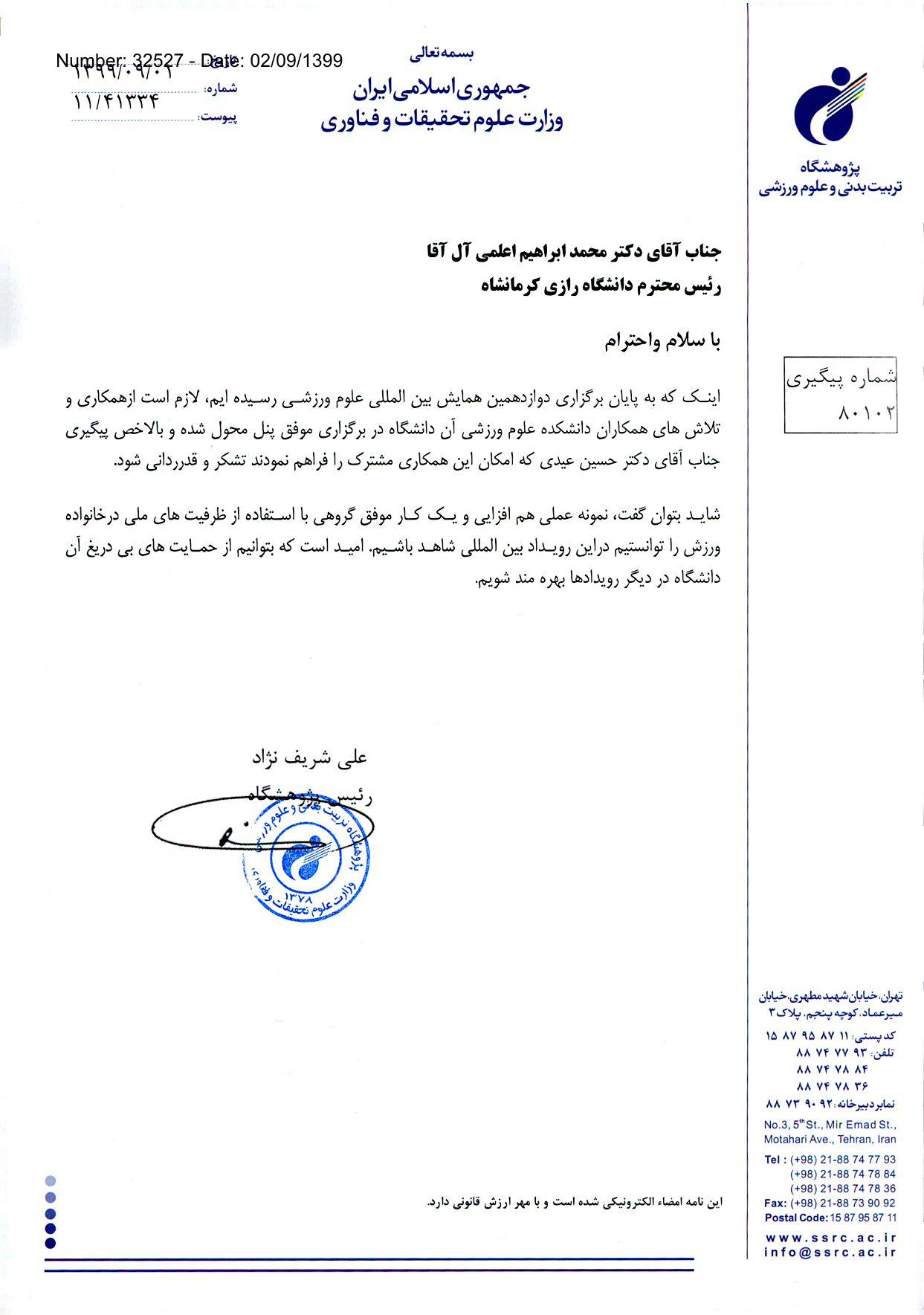 تقدیر و تشکر پژوهشگاه علوم ورزشی از دانشکده علوم ورزشی بابت میزبانی پنل صنعت ورزش