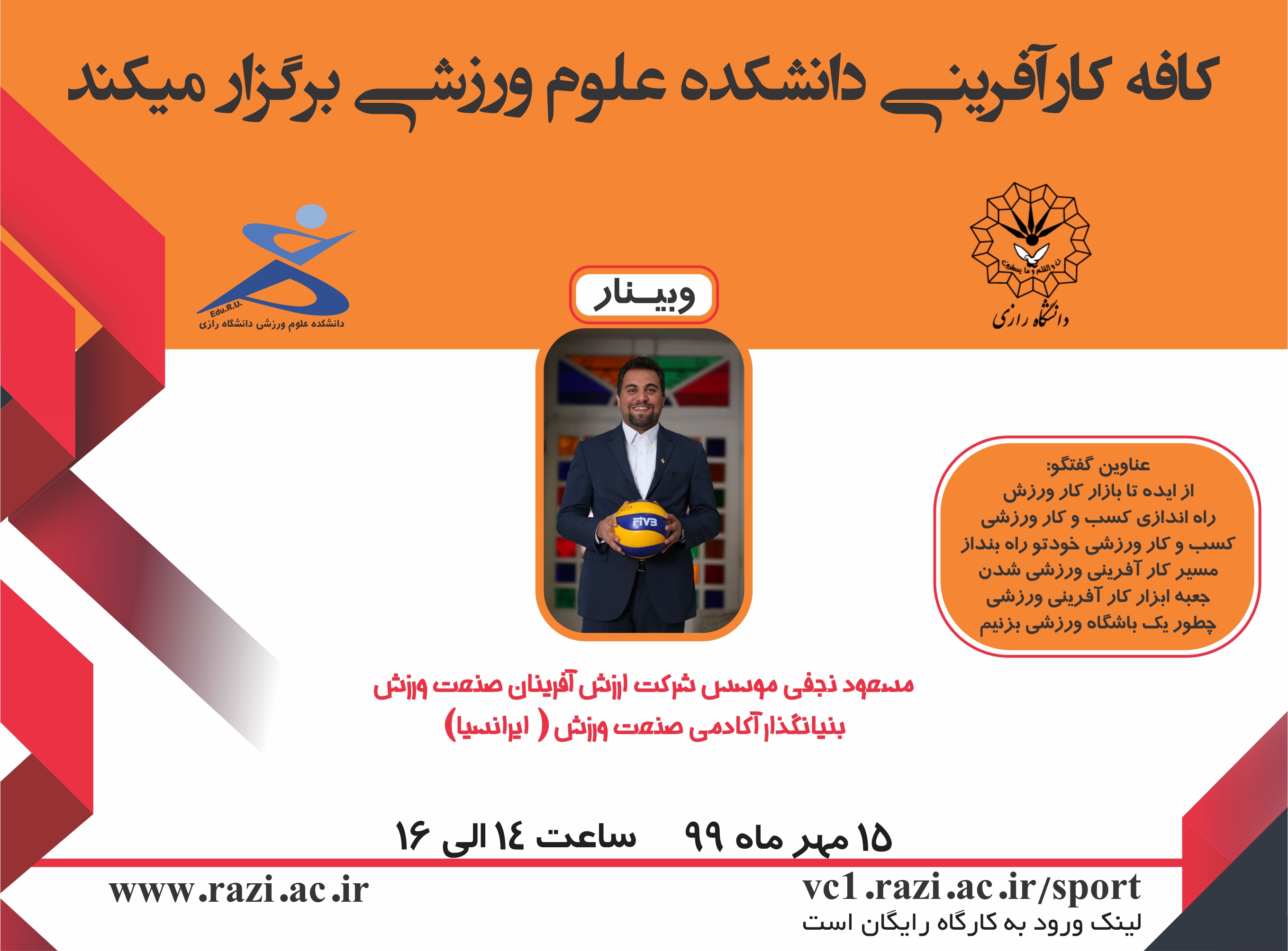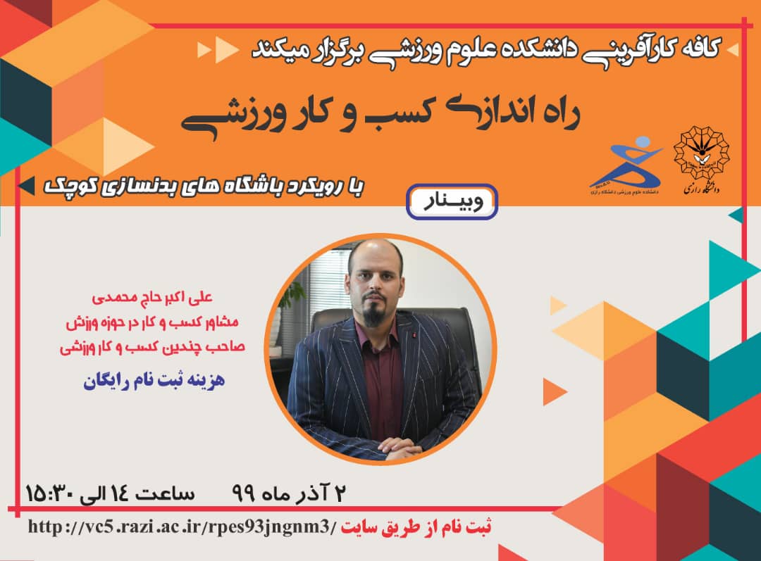 مکان: کافه کارآفرینی دانشکده علوم ورزشی دانشگاه رازی زمان: یکشنبه 1 خرداد ساعت 12 الی 13.30