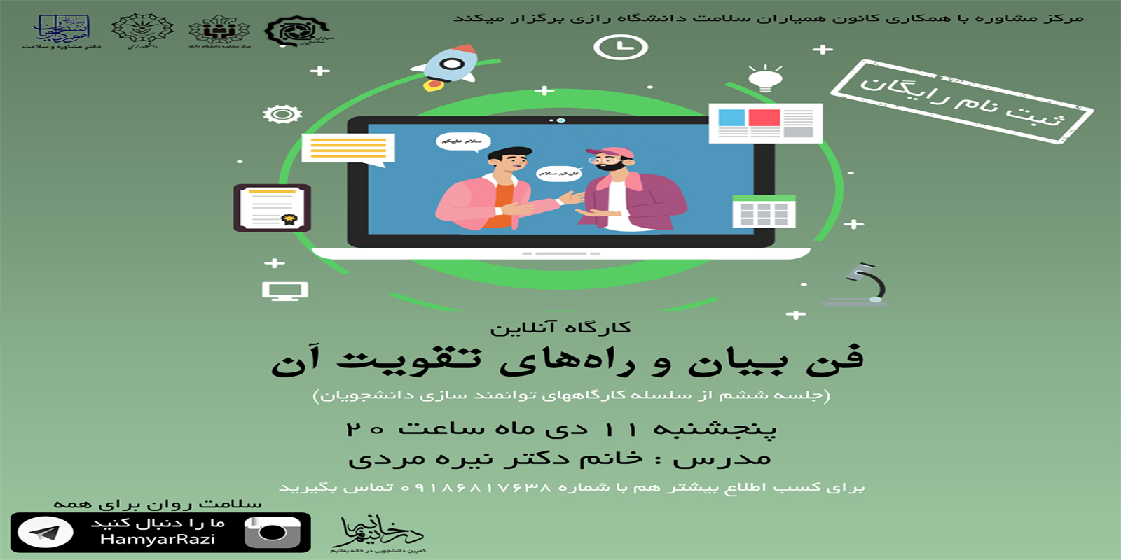339 وبینار فن بیان و راههای تقویت آن وبینار فن بیان و راههای تقویت آن وبینار فن بیان و راههای تقویت آن توسط مرکز مشاوره دانشجویی با هدف توانمندسازی دانشجویان دانشگاه برگزار میگردد. زمان: پنج...
