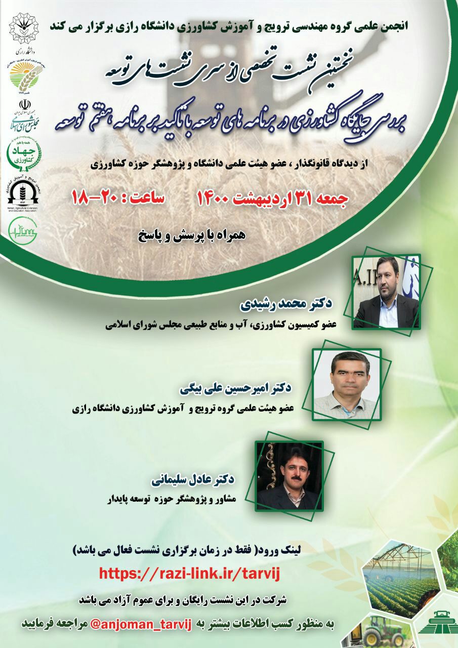 1855 نشست تخصصی "بررسی جایگاه کشاورزی در برنامه های توسعه با تاکید بر برنامه هفتم توسعه" انجمن علمی گروه مهندسی ترویج و آموزش کشاورزی دانشگاه رازی با همکاری مجلس شورای اسلامی، سازمان جهاد کشاورزی...