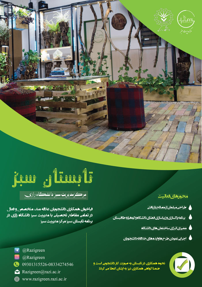 1976 فراخوان همکاری دانشجویان علاقه مند، متخصص و فعال در تمامی مقاطع تحصیلی با مدیریت سبز دانشگاه رازی در برنامه تابستان سبز مرکز مدیریت سبز تابستان سبز فراخوان همکاری دانشجویان علاقه مند، متخصص و...