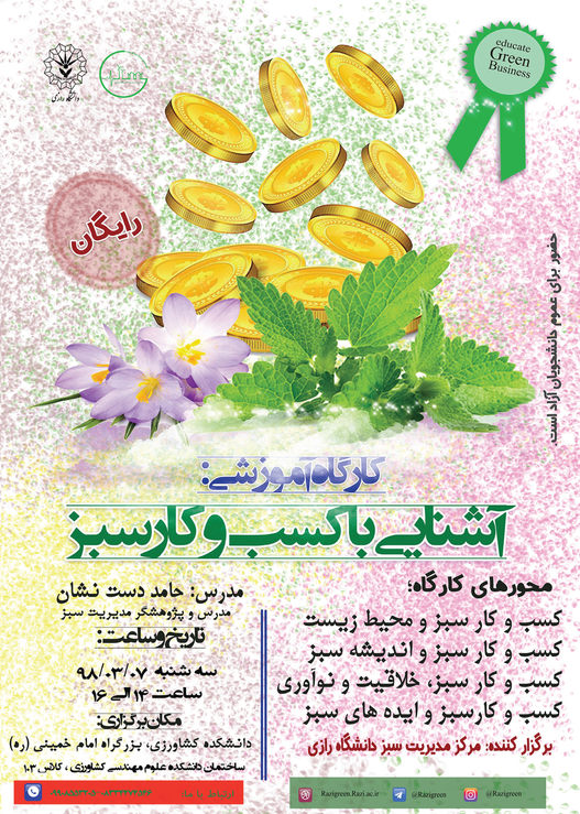 2128 کارگاه آموزشی کسب و کار سبز کارگاه آموزشی کسب و کار سبز در روز سه شنبه،۷ خرداد ماه۱۳۹۸ در دانشکده کشاورزی برگزار می شود. محورهای این کارگاه عبارتند از: کسب و کار سبز و محیط زیست کسب و کار سبز...