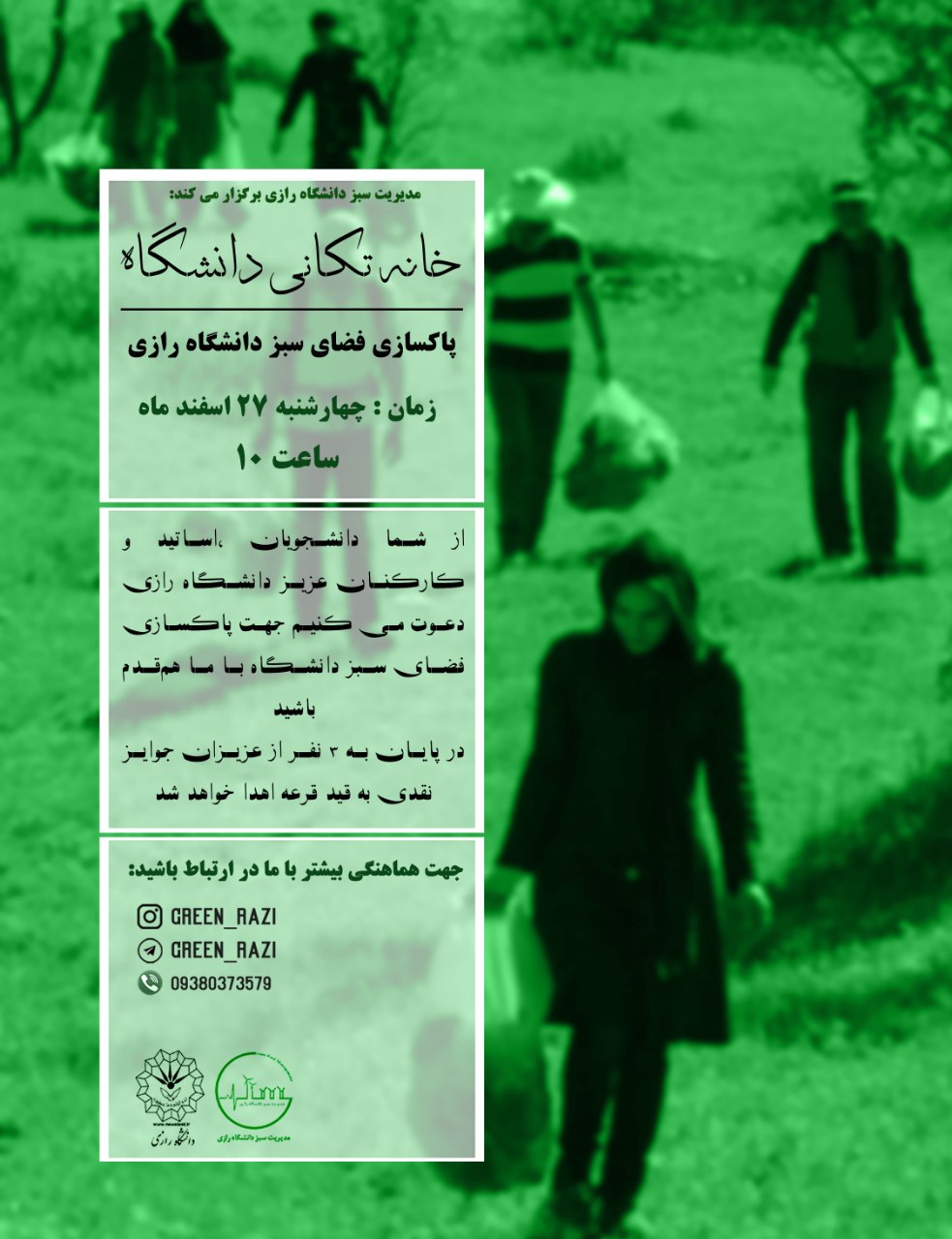 1889 خانه تکانی دانشگاه مدیریت سبز دانشگاه رازی برگزار می کند: خانه تکانی دانشگاه (پاکسازی فضای سبز دانشگاه) زمان: چهارشنبه 27 اسفندماه ساعت 10 صبح محل تجمع: جلوی ساختمان مرکزی پردیس باغ ابریشم...