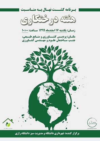 2105 برنامه کاشت نهال به مناسب هفته درختکاری برنامه کاشت نهال در روز یکشنبه 17 اسفند ماه در پردیس کشاورزی و منابع طبیعی، جنب ساختمان علوم و مهندسی کشاورزی و همچنین روز دوشنبه 18 اسفند ماه در...