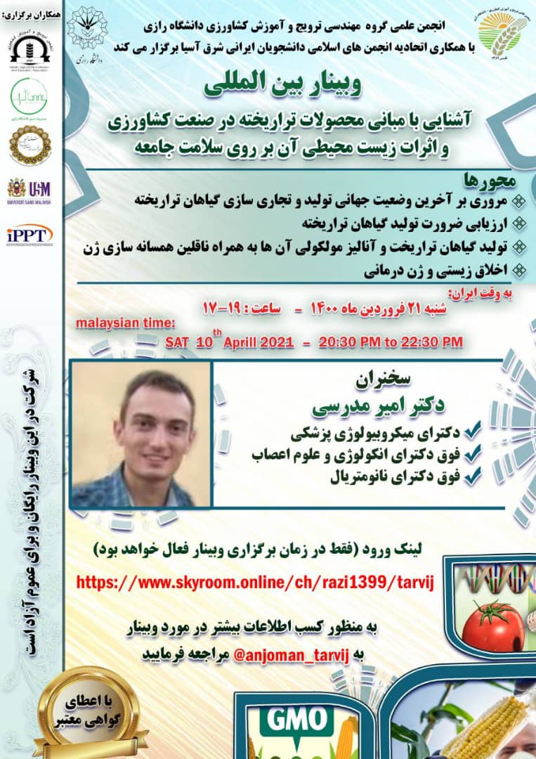 2540 برگزاری وبینار آشنایی با محصولات تراریخته در صنعت کشاورزی و اثرات زیست محیطی آن بر روی سلامت جامعه انجمن علمی گروه مهندسی ترویج و آموزش کشاورزی دانشگاه رازی با همکاری اتحادیه انجمن های اسلامی...
