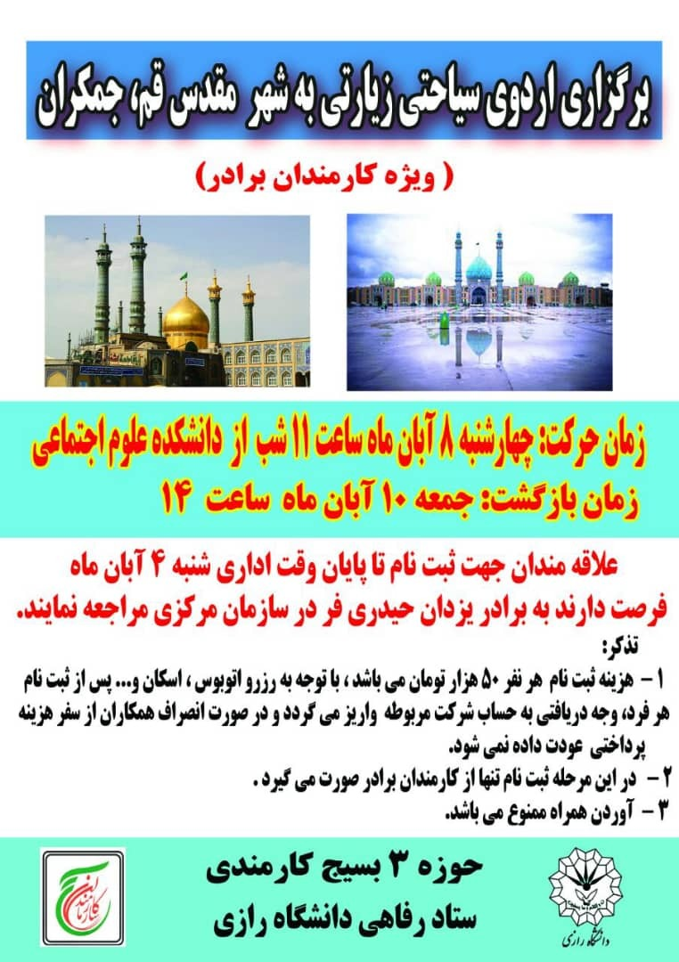 ستاد رفاهی دانشگاه رازی در نظر دارد برنامه سفر زیارتی مشهد مقدس ویژه اعضای هیأت علمی، کارکنان و بازنشستگان دانشگاه، را در تابستان سال جاری برگزار نماید. متقاضیان در صورت تمایل پس از مطالعه...